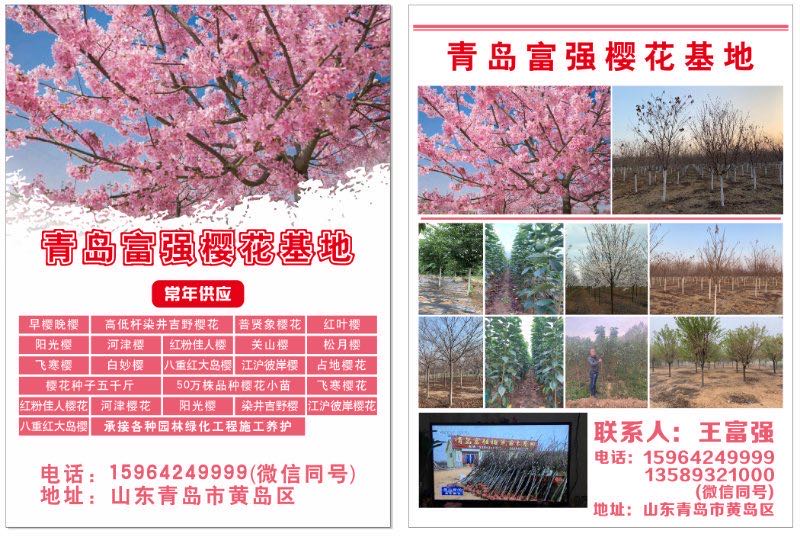 山東青島富強櫻花苗木基地歡迎您(王富強 13780680000、13589321000),青島富強品種櫻花基地常年供應:早櫻晚櫻,高低桿染井吉野櫻花,陽光櫻,河津櫻,紅粉佳人櫻,關山櫻,大漁櫻,松月櫻,飛寒櫻,白妙櫻,美利堅櫻,紅花染井吉野櫻,八重紅大島櫻,江滬彼岸櫻,小松乙女櫻,思川櫻,紅山櫻,雅櫻,獎章櫻,八重紅垂枝櫻等占地櫻花,承接各種園林綠化工程施工養(yǎng)護。歡迎新老客戶來我們這邊考察,購苗買苗服務。